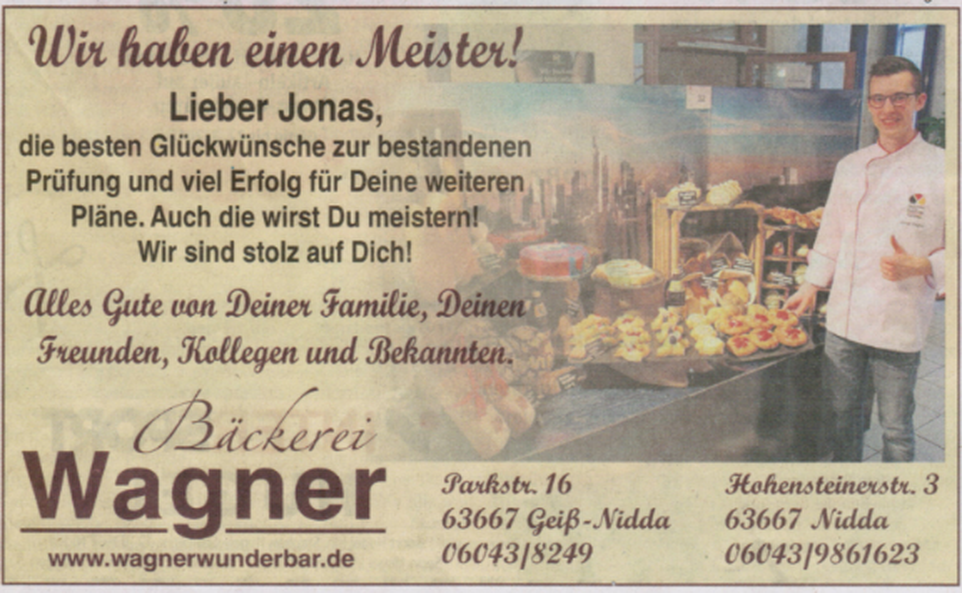Besonders wichtig ist Jonas Wagner die Qualität. „Wir Bäcker arbeiten mit natürlichen Rohstoffen. Es ist immer wieder schön, zu erleben, wie daraus leckere und hochwertige Backwaren entstehen.“ Das Ziel des 21-Jährigen: „Den Menschen aus Nidda und der Umgebung die ehrlichen Produkte eines echten Handwerksbäckers schmackhaft zu machen.“