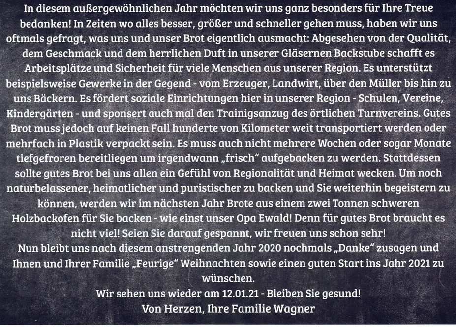 P.S. Wir backen ab dem 14. Januar wieder für euch! Bis dahin wünschen wir unserem fleißigen Team einen erholsamen Urlaub - Danke für eure Unterstützung ❤️